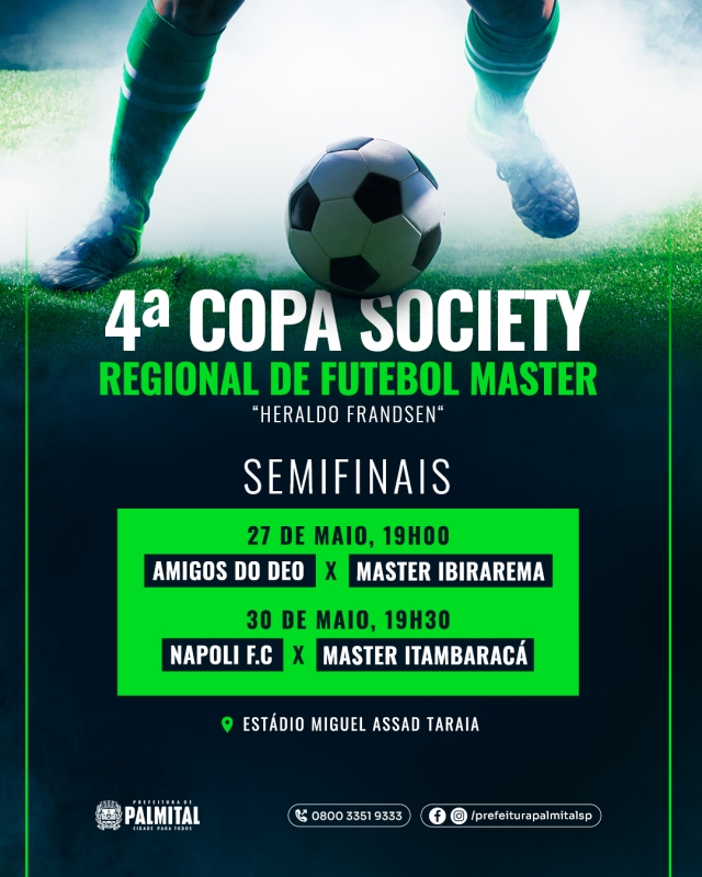 As competições de Futebol Society organizadas pelo Departamento de Esportes da Prefeitura de Palmital entram na fase semifinal com partidas decisivas marcadas para os dias 27 e 30 de maio. Os jogos serão realizados no Estádio Miguel Assad Taraia, a partir das 19 horas.
