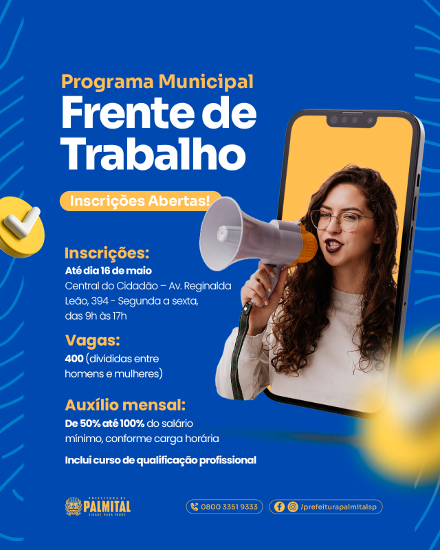 A Prefeitura de Palmital abriu inscrições para o programa "Frente de Trabalho", oferecendo vagas para homens e mulheres em situação de desemprego. Criado para capacitar e auxiliar financeiramente os participantes, o programa é uma chance concreta de se preparar para o mercado de trabalho.