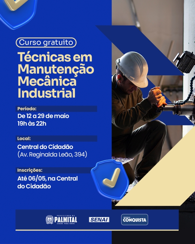 A parceria entre o Senai e a Prefeitura Municipal oferece mais uma capacitação gratuita em Palmital, o curso de Técnicas de Manutenção Mecânica Industrial. As aulas serão realizadas de 12 a 29 de maio em uma unidade móvel que estará no pátio da Central do Cidadão.