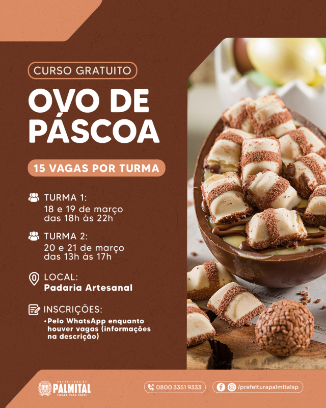 Os interessados devera?o se cadastrar atrave?s do WhatsApp da Prefeitura de Palmital. Basta enviar um "oi" para o nu?mero 3351-9333 ou clicar no link http://www.bit.ly/prefeiturapalmital . Em seguida enviar "101" para iniciar o atendimento humano com o setor de Assiste?ncia e Desenvolvimento Social e prosseguir com a inscric?a?o
