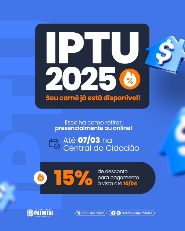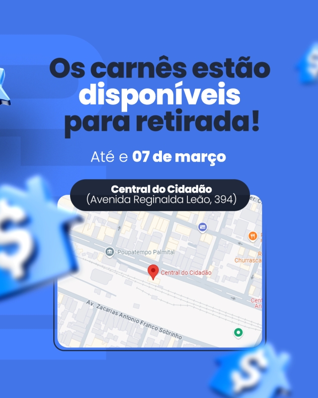 Os carnês do IPTU 2025 já podem ser retirados na Central do Cidadão, até o dia 07 de março. Se você prefere pegar o seu presencialmente, basta comparecer dentro desse período.