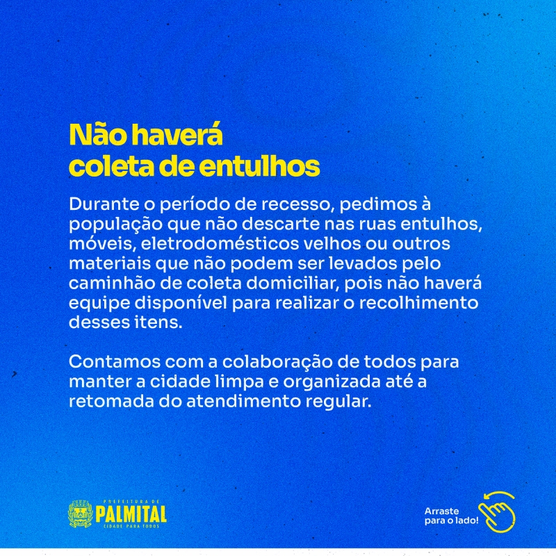 ? Durante o período de recesso, pedimos à população que não descarte nas ruas entulhos, móveis, eletrodomésticos velhos ou outros materiais que não podem ser levados pelo caminhão de coleta domiciliar, pois não haverá equipe disponível para realizar o recolhimento desses itens. Contamos com a colaboração de todos para manter a cidade limpa e organizada até a retomada do atendimento regular.