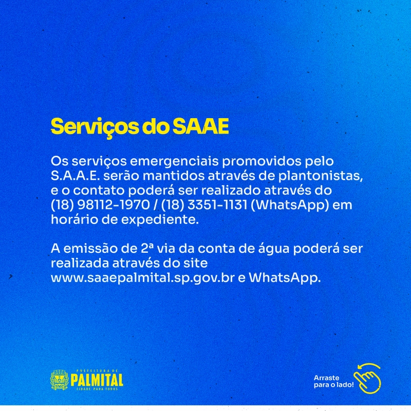 ? Os serviços emergenciais promovidos pelo S.A.A.E. serão mantidos através de plantonistas, e o contato poderá ser realizado através do (18) 98112-1970 / (18) 3351-1131 (WhatsApp) em horário de expediente. A emissão de 2ª via da conta de água poderá ser realizada através do site www.saaepalmital.sp.gov.br e WhatsApp.