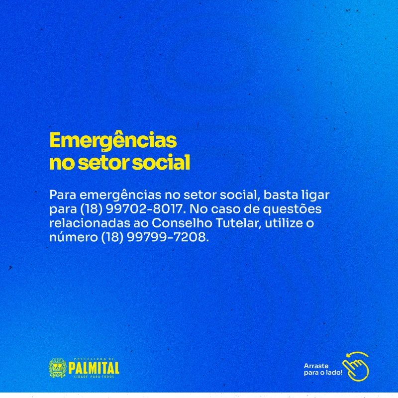 ? Para emergências no setor social, basta ligar para (18) 99702-8017. No caso de questões relacionadas ao Conselho Tutelar, utilize o número (18) 99799-7208.