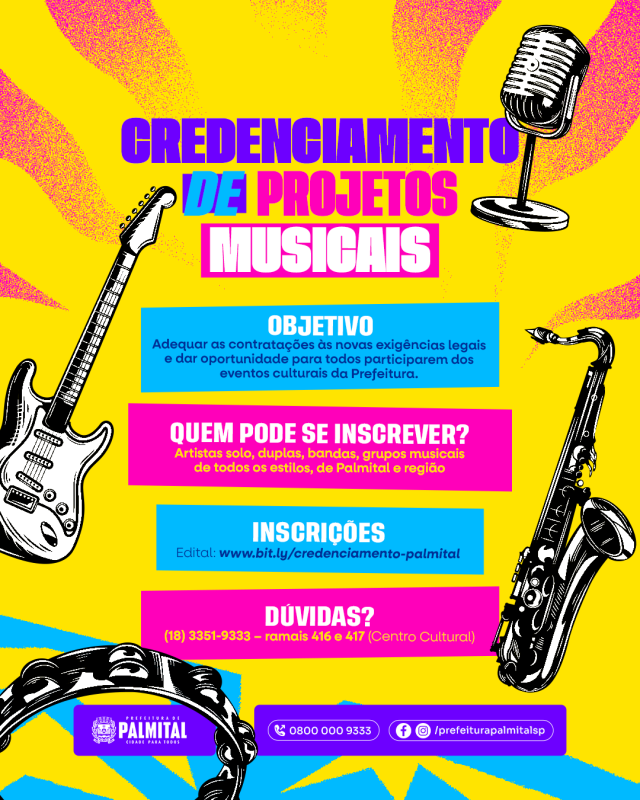 A Prefeitura de Palmital está abrindo cadastro para músicos, bandas e grupos da cidade e região! O objetivo é adequar as contratações às novas exigências legais e criar um banco de talentos, garantindo que todos os interessados tenham a mesma oportunidade de participar dos eventos culturais promovidos pela Prefeitura.