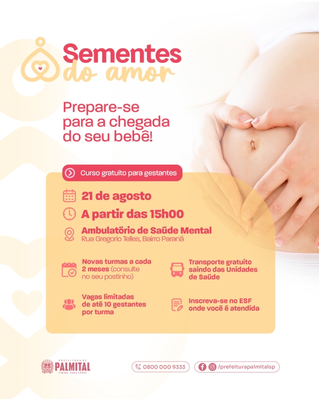 A Prefeitura de Palmital, por meio do Departamento de Saúde, está com inscrições abertas para o grupo de gestantes "Sementes de Amor", uma iniciativa gratuita voltada às futuras mamães atendidas pela rede pública de saúde. O curso terá sua terceira edição no dia 21 de agosto, a partir das 15h00, no Ambulatório de Saúde Mental, localizado na Rua Gregório Telles, no Bairro Paraná.