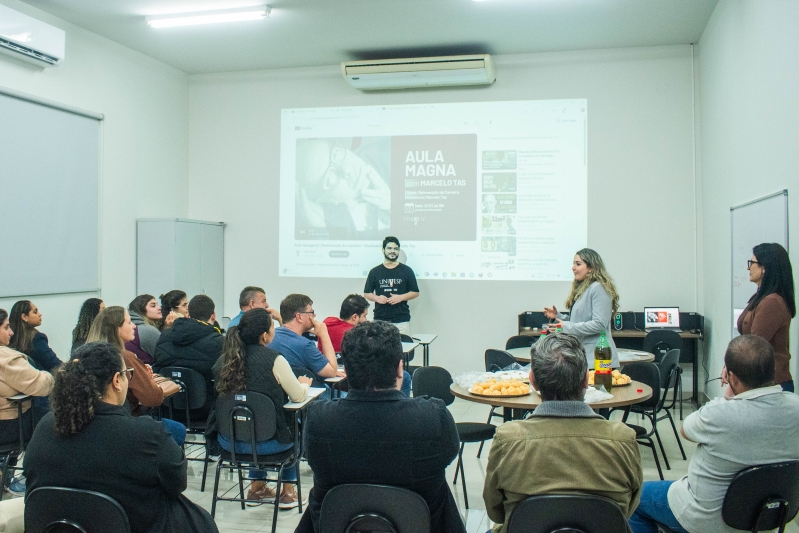 Um dos momentos mais aguardados da noite foi a participação do jornalista e apresentador Marcelo Tas, que conduziu uma palestra motivacional. Com seu estilo bem-humorado e provocador, Tas abordou temas como educação, inovação e protagonismo juvenil, estimulando reflexões entre os calouros e promovendo momentos de integração entre os participantes.