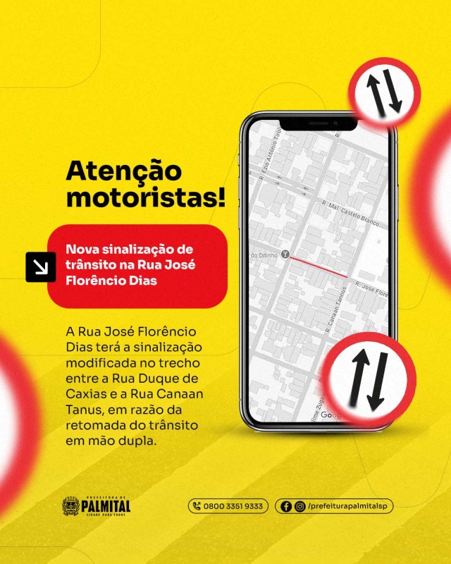 A partir desta sexta-feira (11/07), a Rua José Florêncio Dias volta a operar em mão dupla no trecho entre a Rua Duque de Caxias e a Rua Canaan Tanus. A sinalização no local será atualizada para orientar os condutores e garantir a segurança viária.