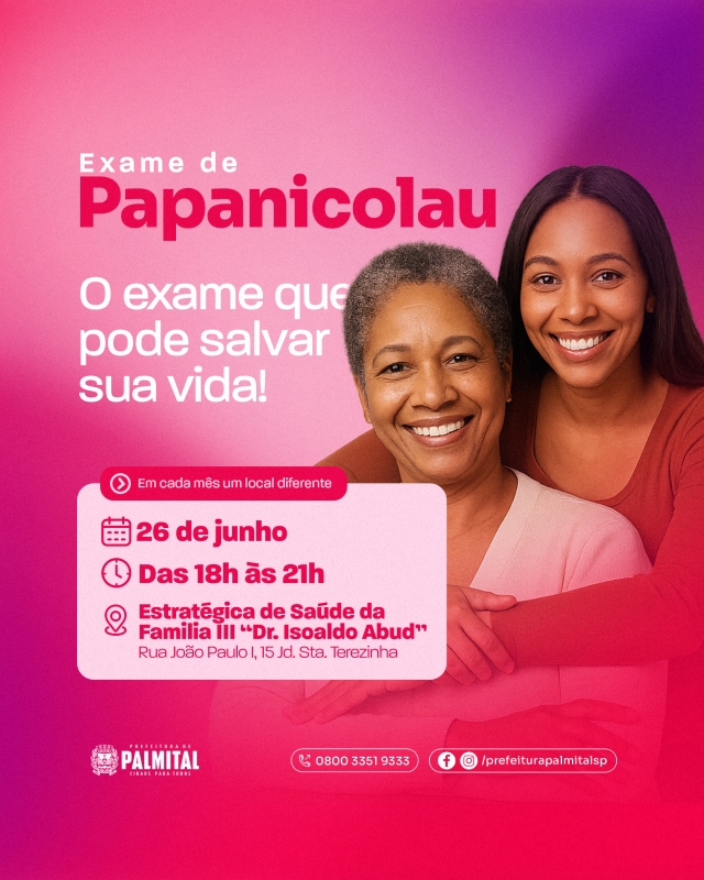 Agora ficou mais fácil cuidar da sua saúde: o exame de Papanicolau está sendo oferecido também no período noturno, das 18h às 21h, uma vez por mês, em unidades diferentes da cidade.