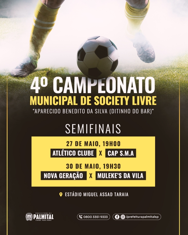 As competições de Futebol Society organizadas pelo Departamento de Esportes da Prefeitura de Palmital entram na fase semifinal com partidas decisivas marcadas para os dias 27 e 30 de maio. Os jogos serão realizados no Estádio Miguel Assad Taraia, a partir das 19 horas.