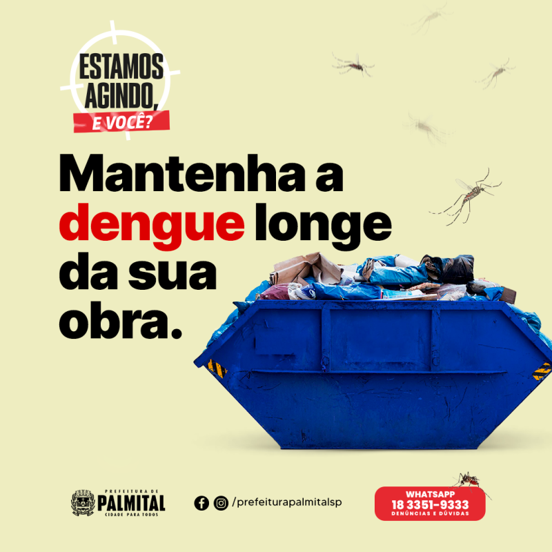 ? Lançamos um canal exclusivo para esclarecer dúvidas e receber denúncias sobre possíveis focos do mosquito. Envie uma mensagem pelo WhatsApp para 18 3351-9333 ou clique no link www.bit.ly/prefeiturapalmital. Digite o número "9" para informações sobre a dengue.