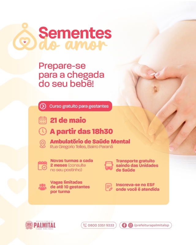 A Prefeitura de Palmital, por meio do Departamento de Saúde, está com inscrições abertas para o grupo de gestantes "Sementes de Amor", uma iniciativa gratuita voltada às futuras mamães atendidas pela rede pública de saúde. O curso terá sua segunda edição no dia 21 de maio, a partir das 18h30, no Ambulatório de Saúde Mental, localizado na Rua Gregório Telles, no Bairro Paraná.