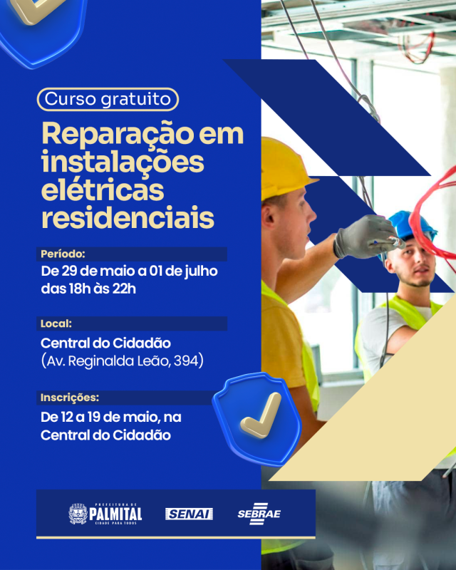 A parceria entre Prefeitura Municipal, SENAI e SEBRAE traz mais uma capacitação gratuita para Palmital, o curso de Reparação em Instalações Elétricas Residenciais. As aulas acontecem no período noturno, de 29 de maio a 1º de julho, ministradas em uma carreta do SENAI que ficará instalada em frente à Central do Cidadão.