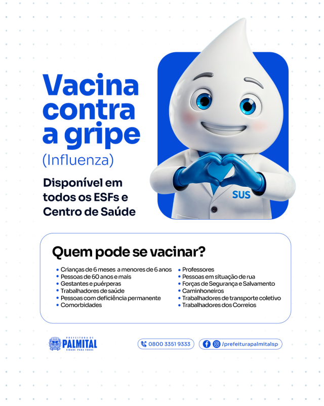 A vacina está disponível em todos os ESF’s e no Centro de Saúde, de segunda a sexta, das 7 horas da manhã às 4 da tarde. O Departamento de Saúde reforça a importância da vacinação contra a disseminação de doenças e conta com a participação da população. A vacina é eficaz, gratuita e segura. Segundo o Ministério da Saúde, o imunizante é capaz de evitar até 70% dos casos graves de gripe, reduzindo riscos de óbito.