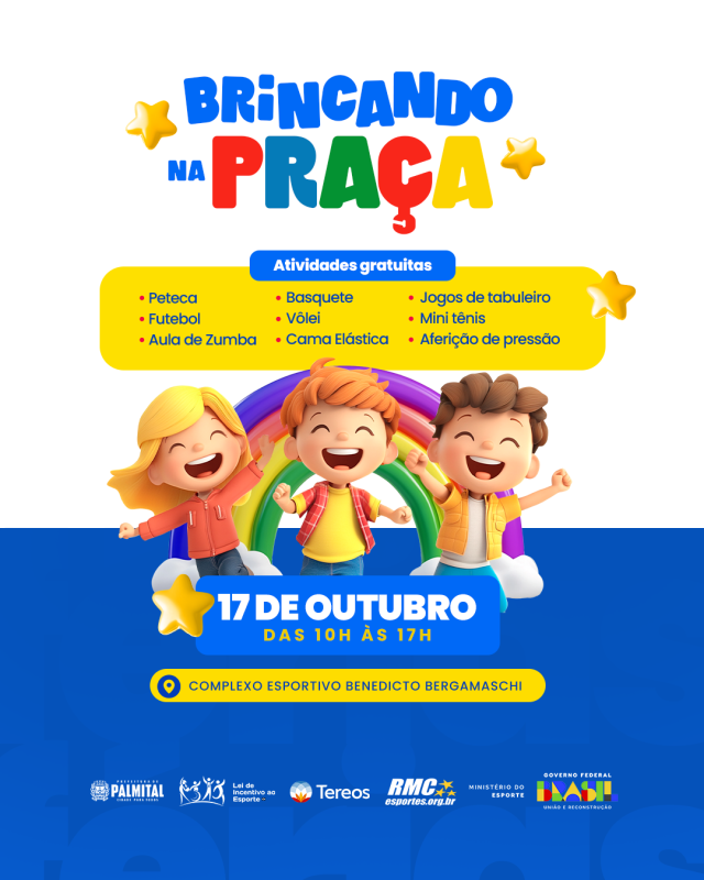 O Complexo Esportivo Benedicto Bergamaschi será palco de um grande evento de lazer e bem-estar no próximo dia 17 de outubro, das 10h às 17h. O projeto "Brincando na Praça" chega a Palmital oferecendo uma programação gratuita e diversificada para toda a família, reunindo atividades esportivas, culturais e de saúde em um só lugar.