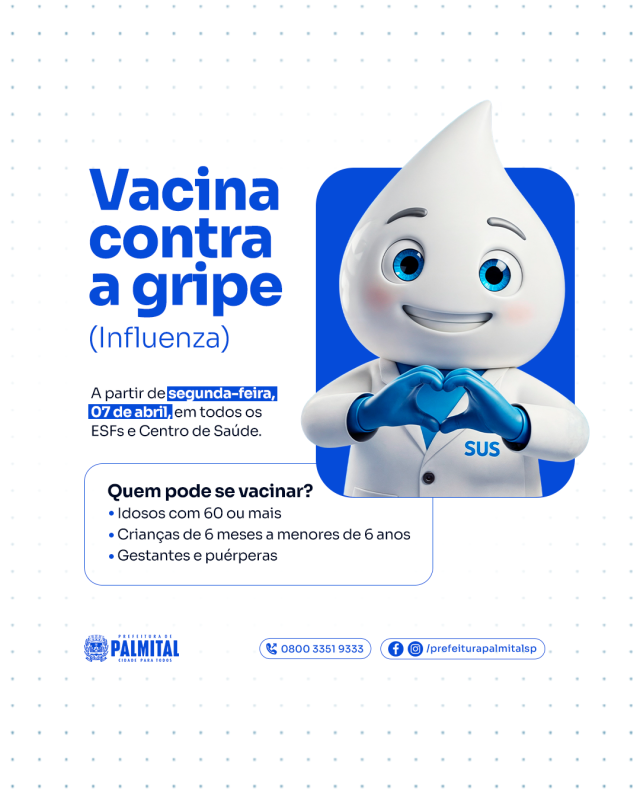 Seguindo o Calendário Nacional de Vacinação, o Departamento de Saúde da Prefeitura inicia a vacinação contra a gripe na próxima segunda-feira, 7 de abril. A imunização é dirigida a pessoas com mais de 60 anos, crianças de 6 meses a menores de 6 anos, gestantes e puérperas - mulheres que deram à luz há pelo menos 45 dias. As doses do imunizante estarão disponíveis em todas as unidades de Estratégia de Saúde da Família e também no Centro de Saúde.