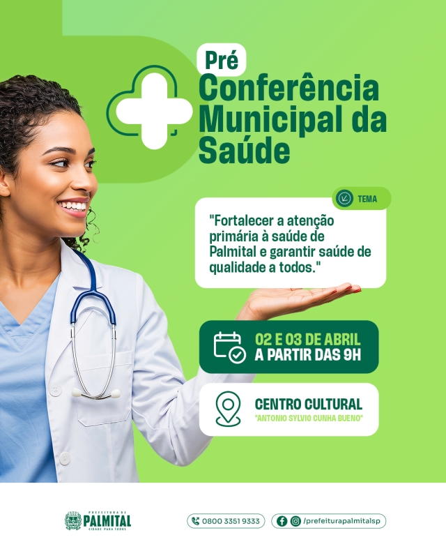 A iniciativa antecede a Conferência Municipal de Saúde, que será realizada no dia 16 de abril. O tema central deste ano será "Fortalecer a Atenção Primária à Saúde de Palmital e garantir saúde de qualidade a todos", com debates organizados em três eixos: I - As Novas Relações de Trabalho e a Saúde do Trabalhador; II - Fortalecimento da Atenção Primária à Saúde: Atendimento, Estrutura e Inovação; III - Promoção da Saúde e Prevenção de Doenças.
