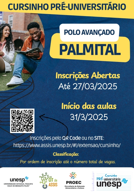 O Cursinho Pré-Universitário da Unesp é gratuito e te prepara para o Ensino Superior! ??? Preparação para vestibulares e ENEM;? Formato virtual, estude no seu tempo;? As aulas começam no dia 31 de março.? Inscreva-se agora: http://bit.ly/4c7cj7y?? Corra! Últimos dias! As inscrições vão até 27 de março e a classificação é por ordem de inscrição até o limite de vagas!