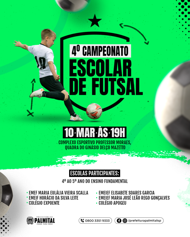 O Departamento de Esportes da Prefeitura de Palmital vai promover mais uma edição do Campeonato Escolar de Futsal, reunindo times formados por alunos do 4º e 5º anos do ensino fundamental de escolas municipais e particulares do município. A abertura da competição será realizada no dia 10 de março, às 19 horas, no Ginásio Delço Mazetto, Complexo Esportivo Professor Moraes.