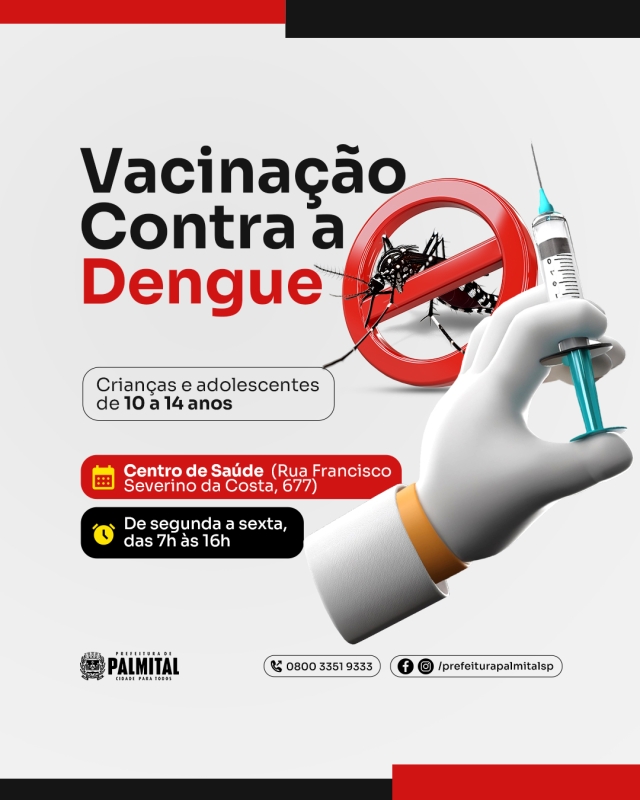 O Departamento de Saúde da Prefeitura inicia a imunização de crianças e adolescentes contra a Dengue. A vacina está disponível para o público alvo na faixa etária entre 10 e 14 anos.  Para receber a dose, basta se dirigir ao Centro de Saúde, de segunda a sexta, entre as 7 da manhã e 4 horas da tarde. O imunizante é administrado em duas doses e reduz o risco de complicações e hospitalizações pela doença. Pode ser tomada por