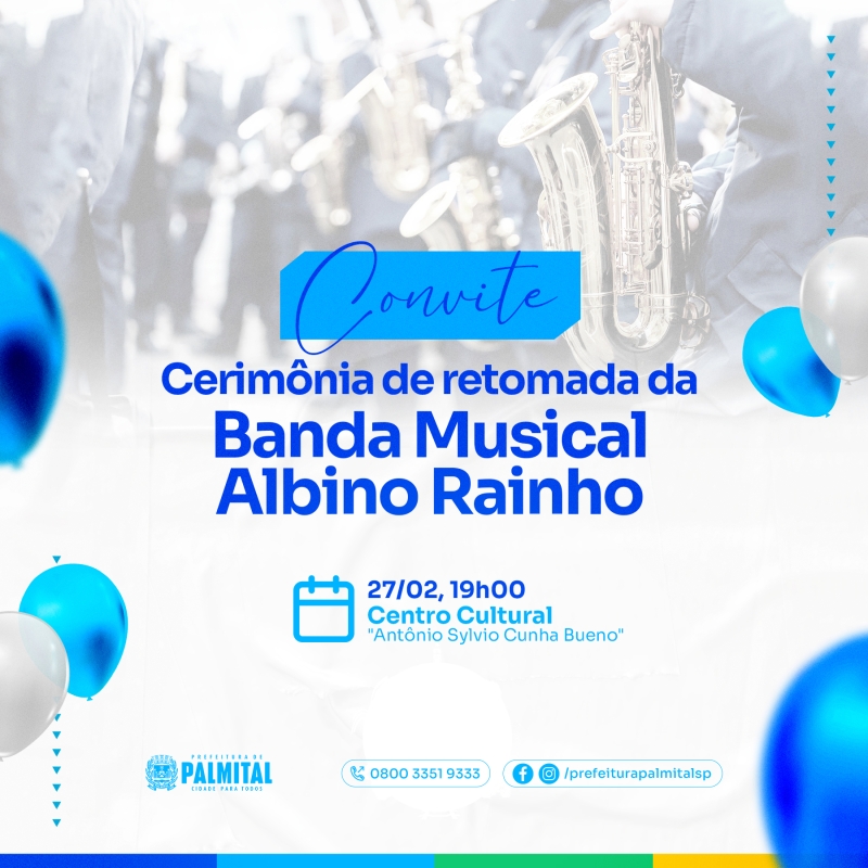 Após um período de inatividade, a Banda Musical Albino Rainho retoma suas atividades e convida a comunidade para um evento especial de celebração. A cerimônia acontecerá no dia 27 de fevereiro, às 19h, no Centro Cultural "Antônio Sylvio Cunha Bueno" em Palmital, marcando oficialmente o retorno de um dos projetos musicais mais importantes da cidade.