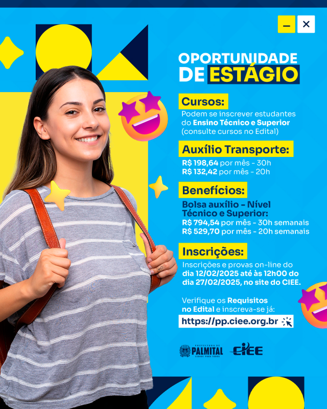 A Prefeitura Municipal de Palmital, em parceria com o Centro de Integração Empresa-Escola (CIEE), abriu vagas de estágio para estudantes do Ensino Técnico e Superior. A iniciativa busca oferecer experiência profissional aos jovens e contribuir para a qualificação de novos talentos.