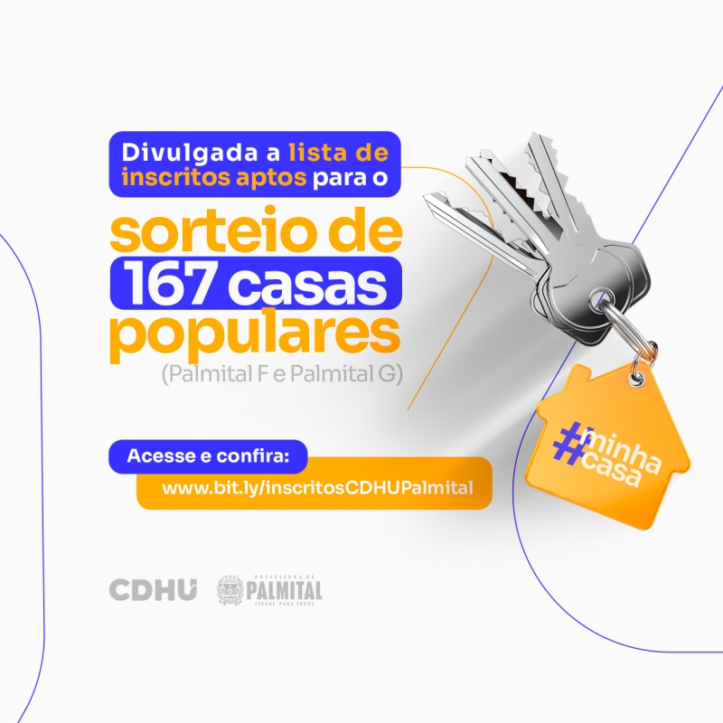?Atenção!?Já foi divulgada a lista dos inscritos aptos a participarem do sorteio para as moradias populares do CDHU Palmital F e Palmital G. A listagem está disponível através do link: www.bit.ly/inscritosCDHUPalmitalA data do sorteio será divulgada em breve!