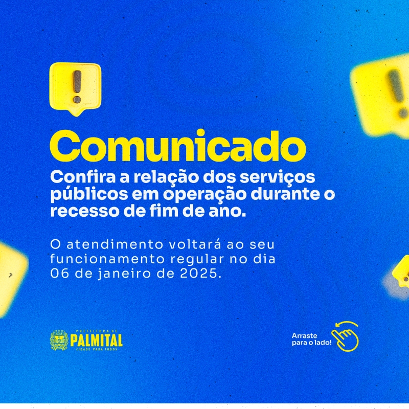 A Prefeitura de Palmital comunica que, em razão do recesso de final de ano, algumas repartições públicas encerrarão suas atividades em 2024 na sexta-feira, dia 20 de dezembro, retomando o expediente normalmente no dia 6 de janeiro de 2025.