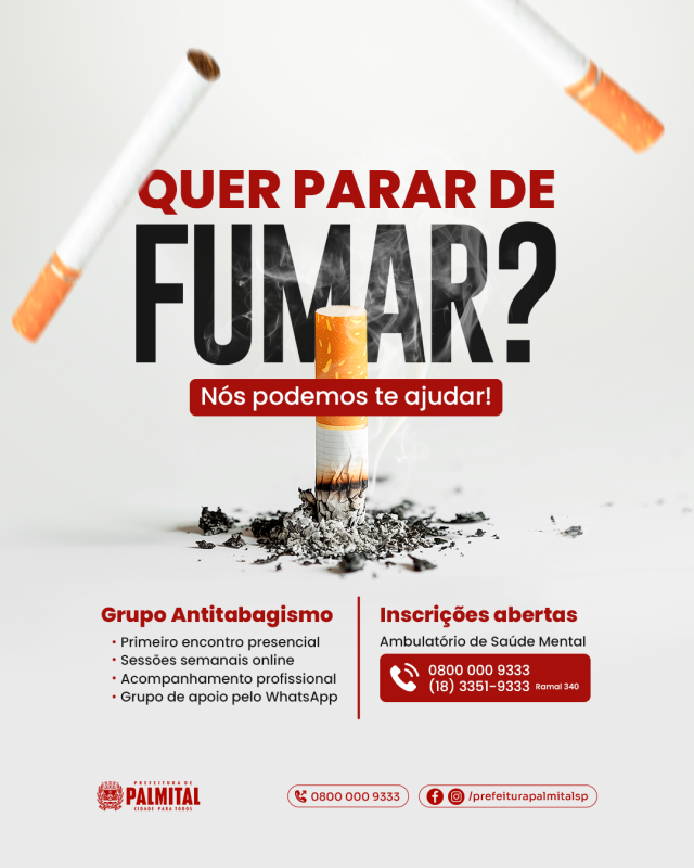 O Departamento de Saúde de Palmital, por meio do Ambulatório de Saúde Mental, inicia agora em setembro a implantação do Grupo Antitabagismo em modelo híbrido, iniciativa que combina encontros presenciais e online para apoiar pessoas que desejam abandonar o tabagismo.