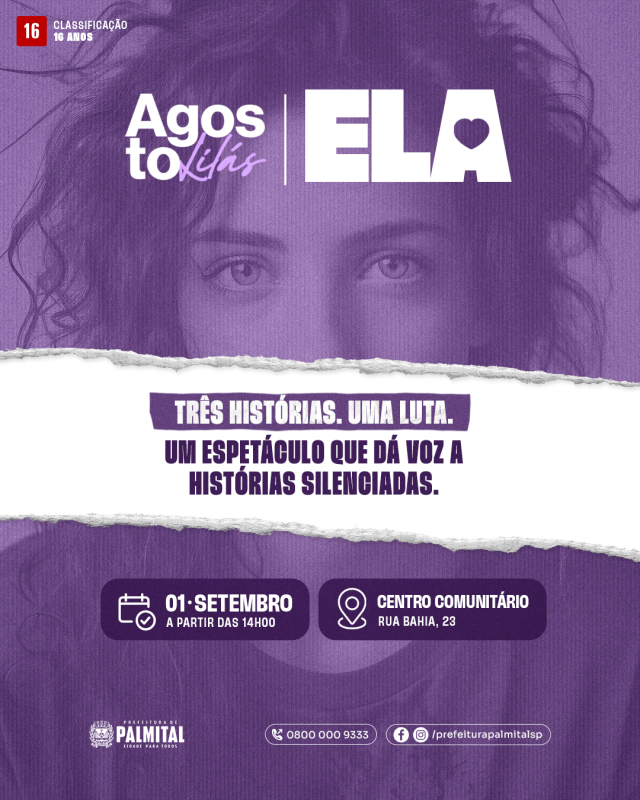 No próximo dia 1º de setembro, às 14h, o Centro Comunitário Segundo Montanher recebe a peça teatral "ELA", da Cia. Bambolina. O espetáculo tem classificação indicativa de 16 anos e integra as ações do Agosto Lilás, campanha de enfrentamento à violência contra a mulher.