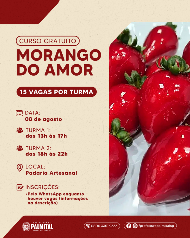 Os interessados deverão se cadastrar pelo WhatsApp da Prefeitura de Palmital. Basta enviar um "oi" para o número 3351-9333 ou acessar o link: www.bit.ly/prefeiturapalmital. Em seguida, envie "101" para iniciar o atendimento com o setor de Assistência e Desenvolvimento Social e concluir a inscrição.
