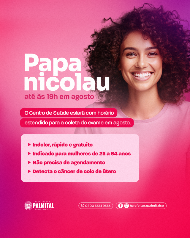Durante todo o mês de agosto, o Centro de Saúde estará com horário estendido até as 19h para a realização do exame de Papanicolau. A iniciativa busca facilitar o acesso das mulheres ao exame preventivo, especialmente aquelas que têm dificuldade em comparecer durante o horário comercial.