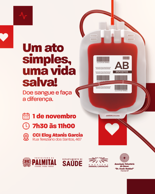 No próximo sábado, 1º de novembro, Palmital sediará uma Campanha de Doação de Sangue no Centro de Convivência do Idoso "Eloy Atanis Garcia", localizado no Bairro Paraná. A ação acontecerá das 7h30 às 11h e é promovida em parceria com o Hospital Amaral Carvalho de Jaú e a Associação do Câncer "Fuade Haddad".